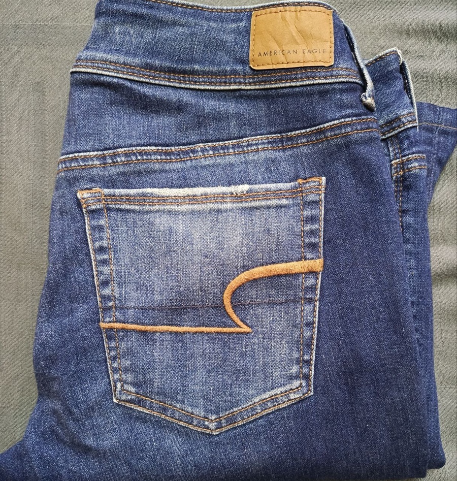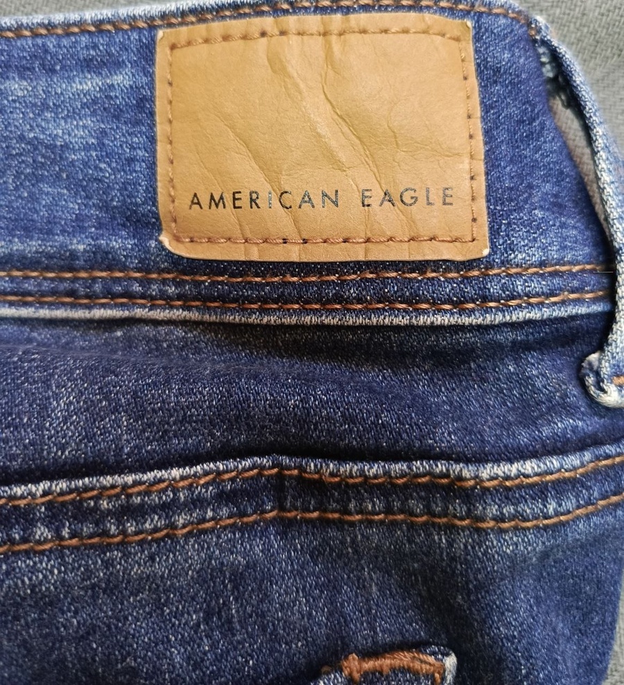 شعار العلامة التجارية American Eagle مطبوع على الخصر وعلى الملصق الجلدي الخلفي.