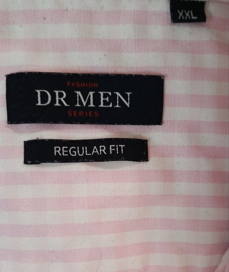 قميص رجالي من علامة DR MEN — لون وردي فاتح مع خطوط بيضاء رفيعة، قصّة Regular Fit، وخامة قطن ناعمة: