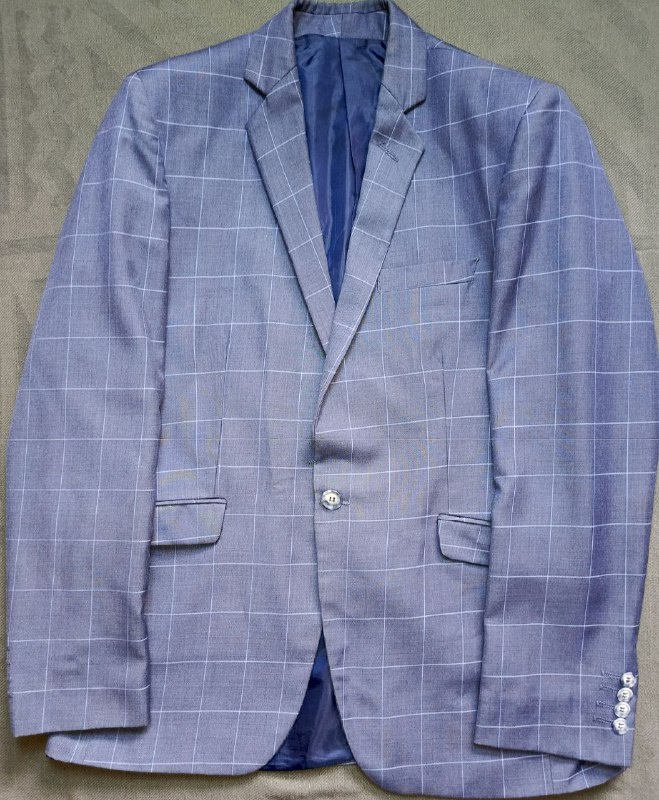 جاكيت أنيق من علامة Frappoli، مُنتج محليًا في الأردن — تصميم شَبَكة كلاسيكي (أزرق فاتح + أبيض)، بطانة ساتان زرقاء فاخرة، وأزرار معدنية لامعة.