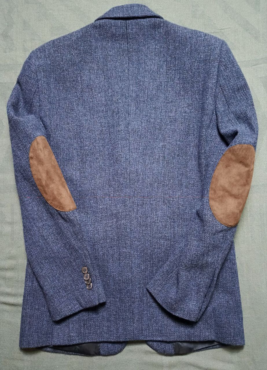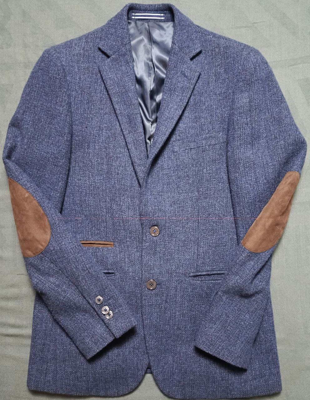 - اللون والتصميم: أزرق فاتح بنسيج مخمل خفيف، مع تفصيلات جلدية على المرفقين تعطيه لمسة كلاسيكية وأنيقة.
