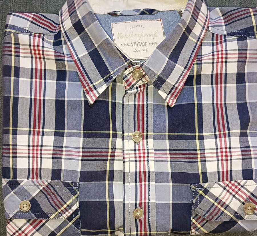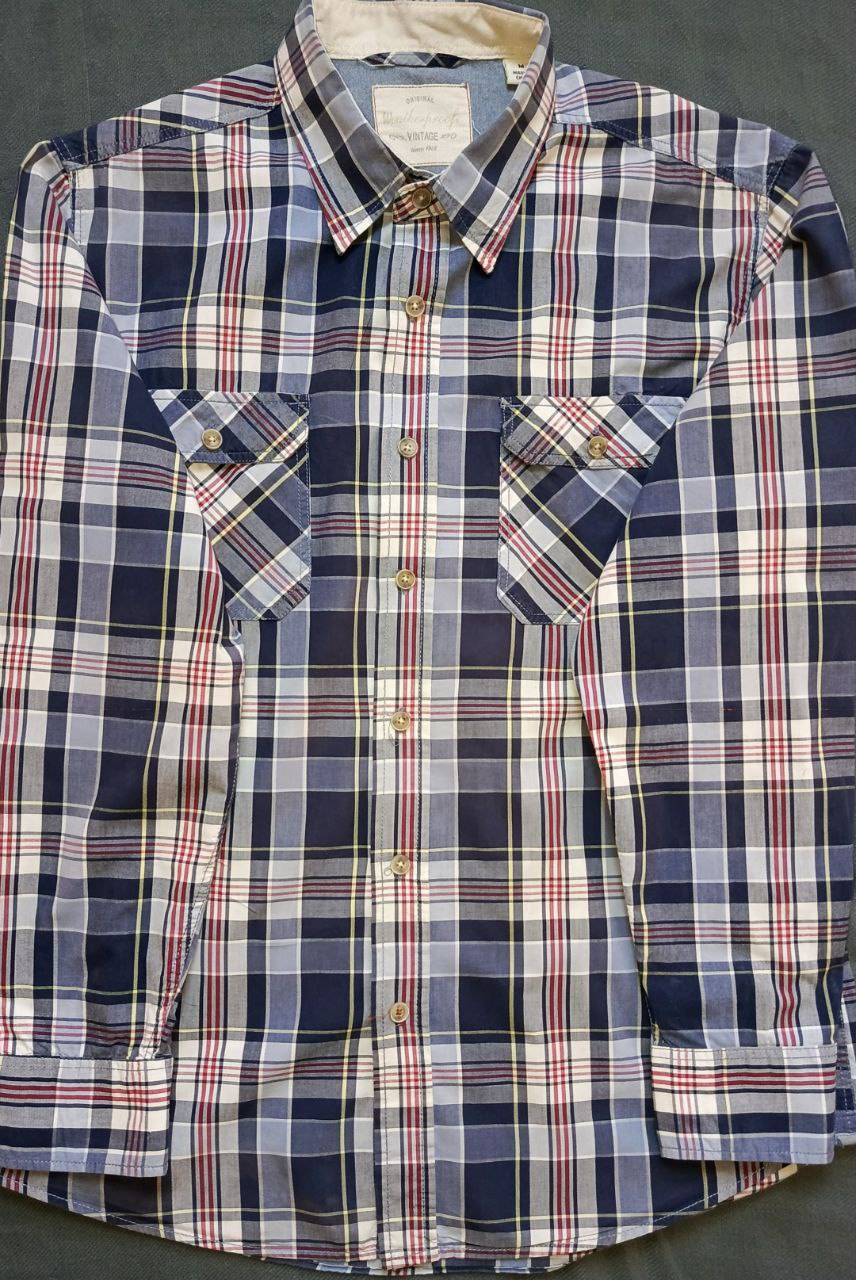 شطرنجي أنيق: أزرق فاتح + أبيض + خطوط حمراء وصفراء دقيقة, قصّة كلاسيكية مريحة, حالة ممتازة مع ارتداء خفيف (لا تمزقات، لا تشققات).
