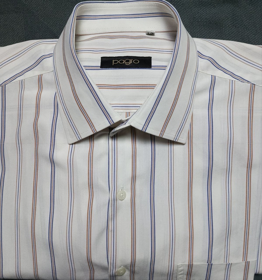 قطعة أنيقة من علامة Pagro الإيطالية المرموقة — قميص شرائطي كلاسيكي بألوان هادئة (أبيض + أزرق + بني فاتح)، مثالي للعمل غير الرسمي، النزهات، أو إطلالة يومية أنيقة.