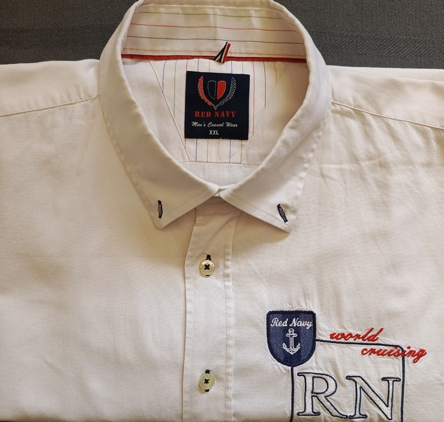 التطريز: يتميز بتطريز مميز على الصدر (شعار الماركة مع مرساة وحروف RN وكلمة world cruising) وعلى طرف القميص السفلي (رقم 5 Red Navy).