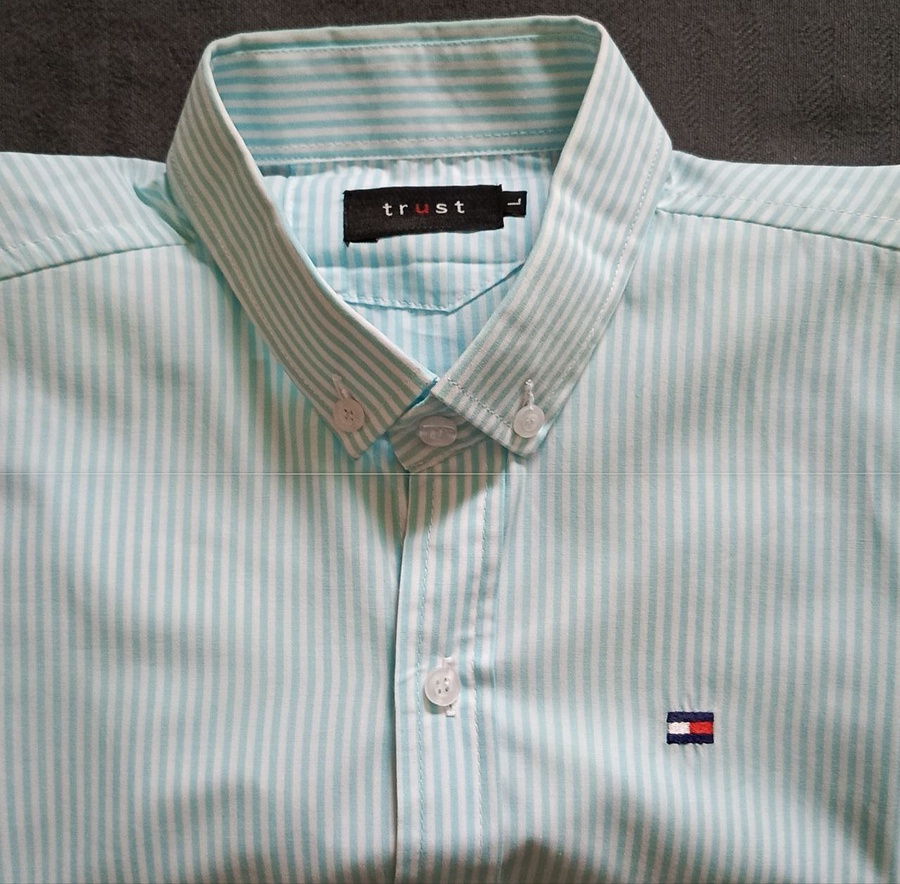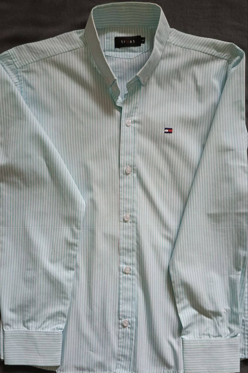 قميص كاجوال أنيق من علامة Traust الأوروبية، مع شعار تومي هيلفيغر المطرّز على الصدر — يُعتقد أنه إصدار تعاوني أو مُصنّع تحت ترخيص. لونه منعش، وتصميمه مثالي للإطلالات اليومية الرسمية-كاجوال.