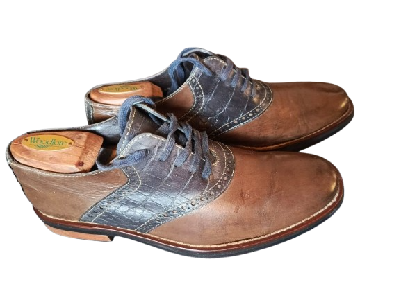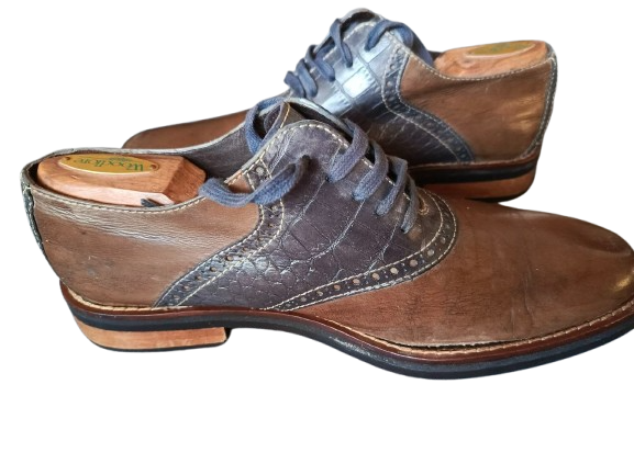 حذاء رجالي أنيق من علامة Cole Haan الشهيرة، يتميز بتصميم ثنائي اللون فريد: أزرق داكن معدني (أو رمادي أزرق) في الجزء العلوي والوسطي، مع لمسات بني فاتح في المقدمة والجانبين — مما يمنحه طابعًا عصريًا وأنيقًا يناسب المناسبات الرسمية والعصرية على حد سواء. تفاصيل الخياطة الدقيقة والجلد الطبيعي تعكس جودة الصنع المميزة.