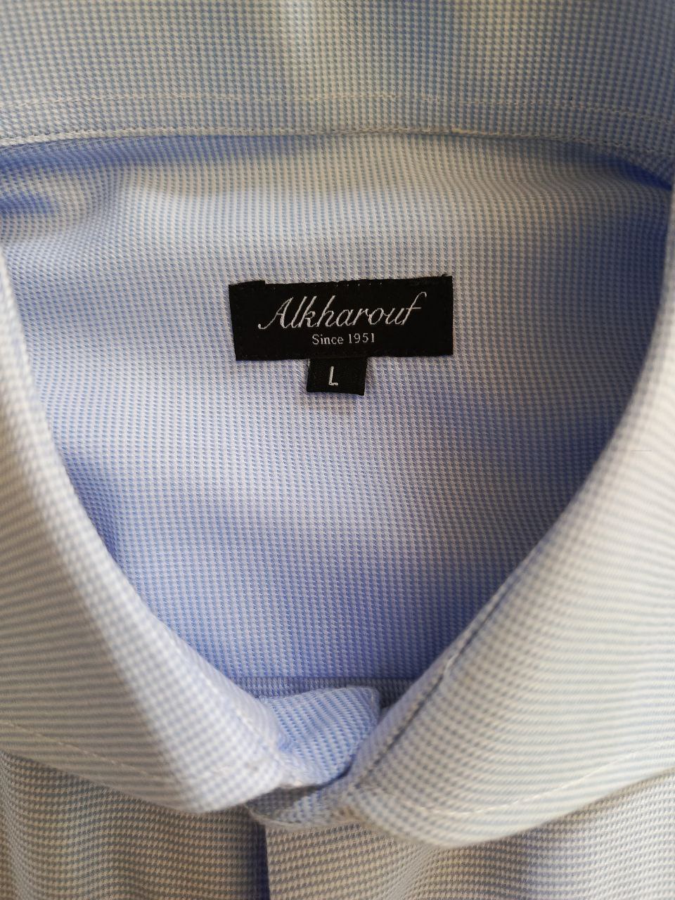قميص رجالي أزرق فاتح بنقشة دقيقة من Alkharouf – مقاس L | حالة ممتازة