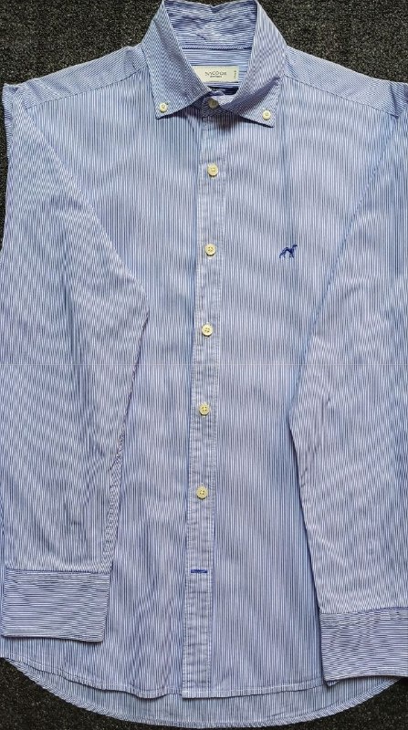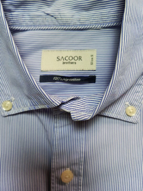 قميص رجالي أزرق بخطوط بيضاء من Sacoor Brothers – مقاس S | حالة ممتازة