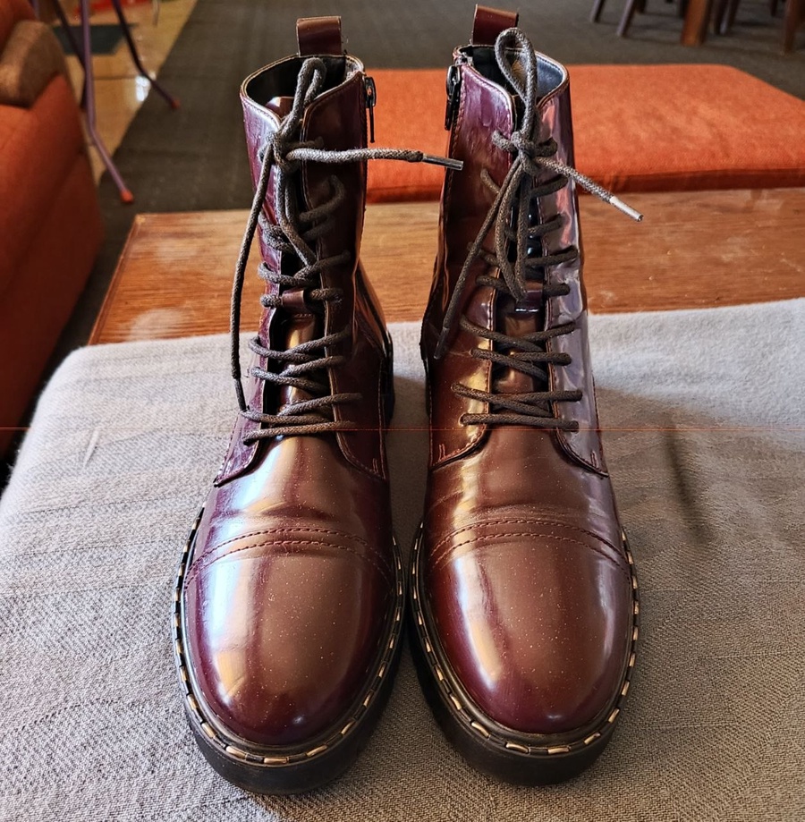 الستايل: تصميم عسكري/كلاسيكي (Combat Boots) يشبه ستايل Dr. Martens الشهير، مع الخياطة الصفراء المميزة حول النعل الأسود السميك.