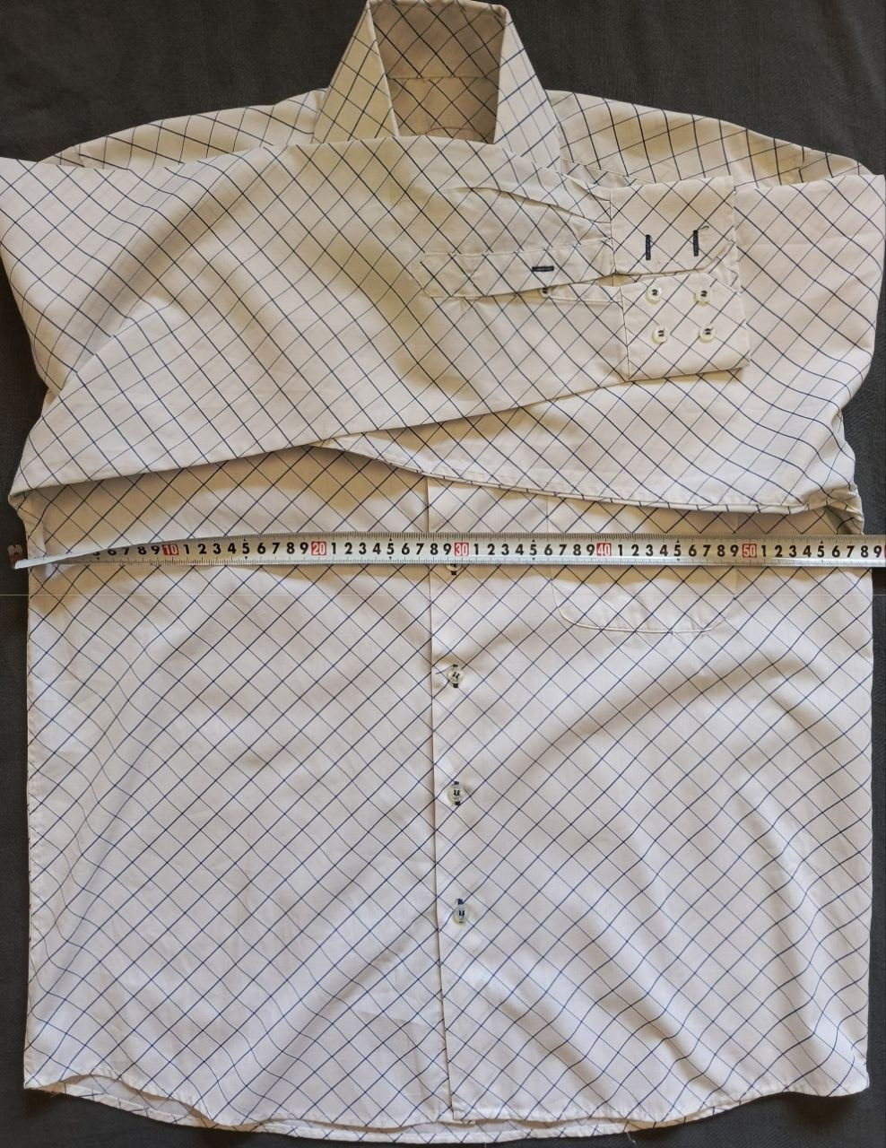 اللون/النقشة: خلفية بيضاء/كريمية مع نقش كاروه ماسي (Diamond Check) بخطوط زرقاء رفيعة. تصميم كلاسيكي يناسب جميع الأوقات ويعطي طابعاً مرتباً.