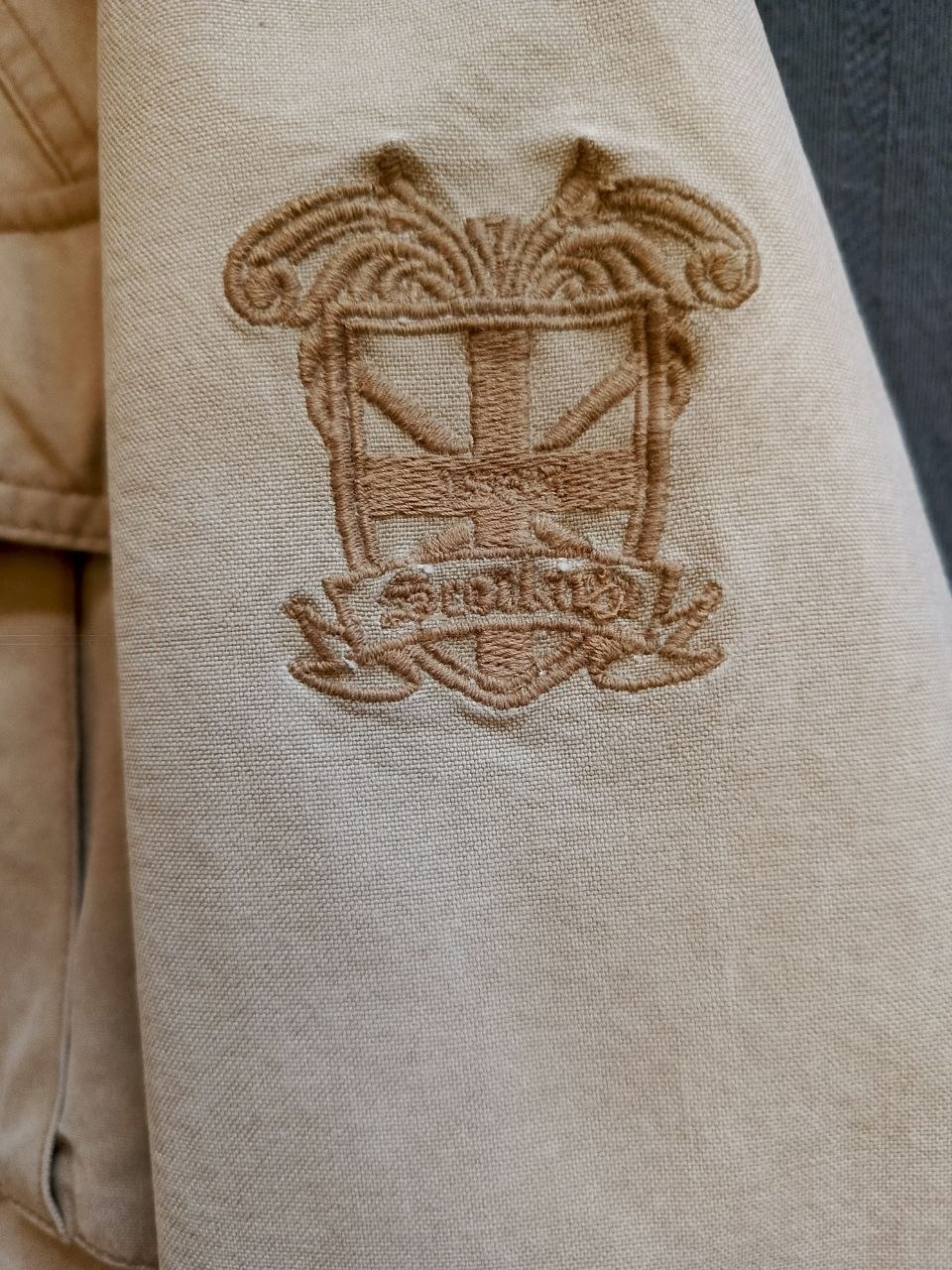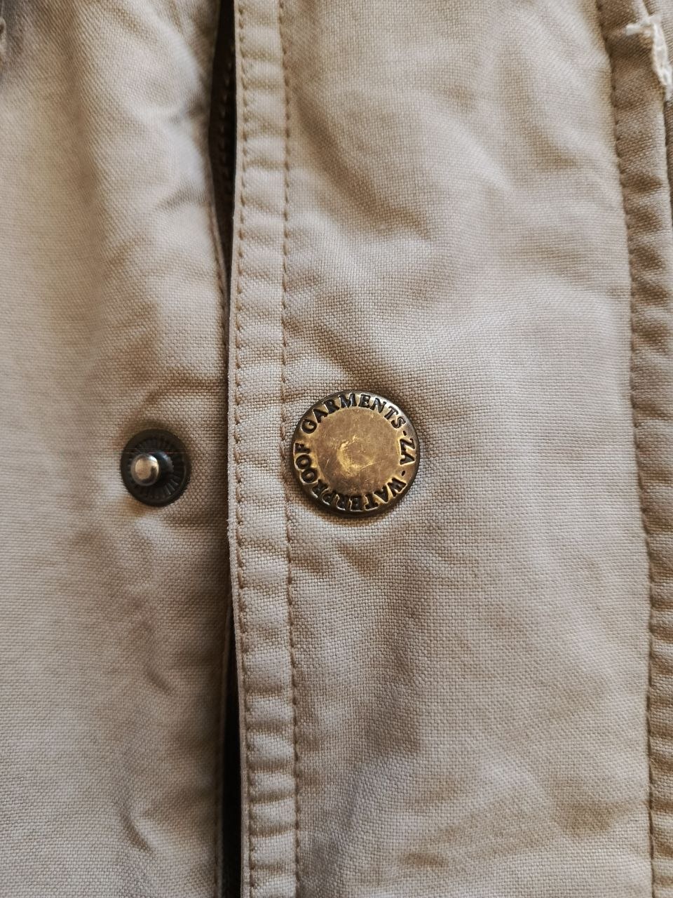 - التفاصيل المميزة: ياقة من قماش الكوردروي (Corduroy) البني giving a vintage look، بطانة داخلية دافئة بنقشة مربعات (Plaid) بألوان ترابية، شعار مطرز (Embroidered Crest) على الكم الأيسر، وأزرار معدنية مميزة منقوش عليها "Waterproof Garments".